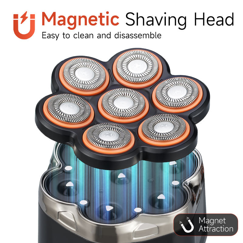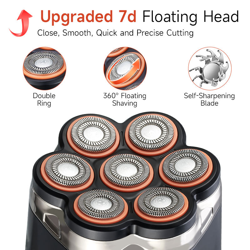 The 7D Electric Shaver for Men is designed for a close, comfortable shave. Equipped with 7 floating rotary blades, this electric razor adapts to your facial contours for maximum precision and comfort. Ideal for head shaving, beard grooming, and facial cleansing.